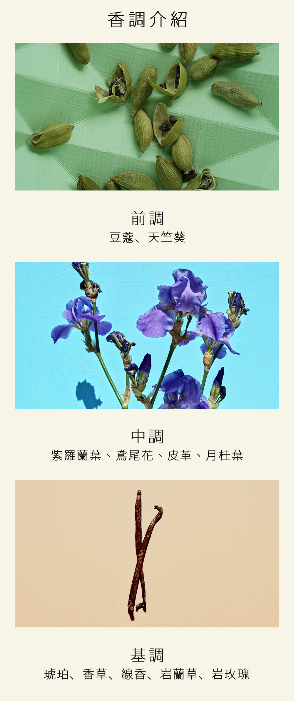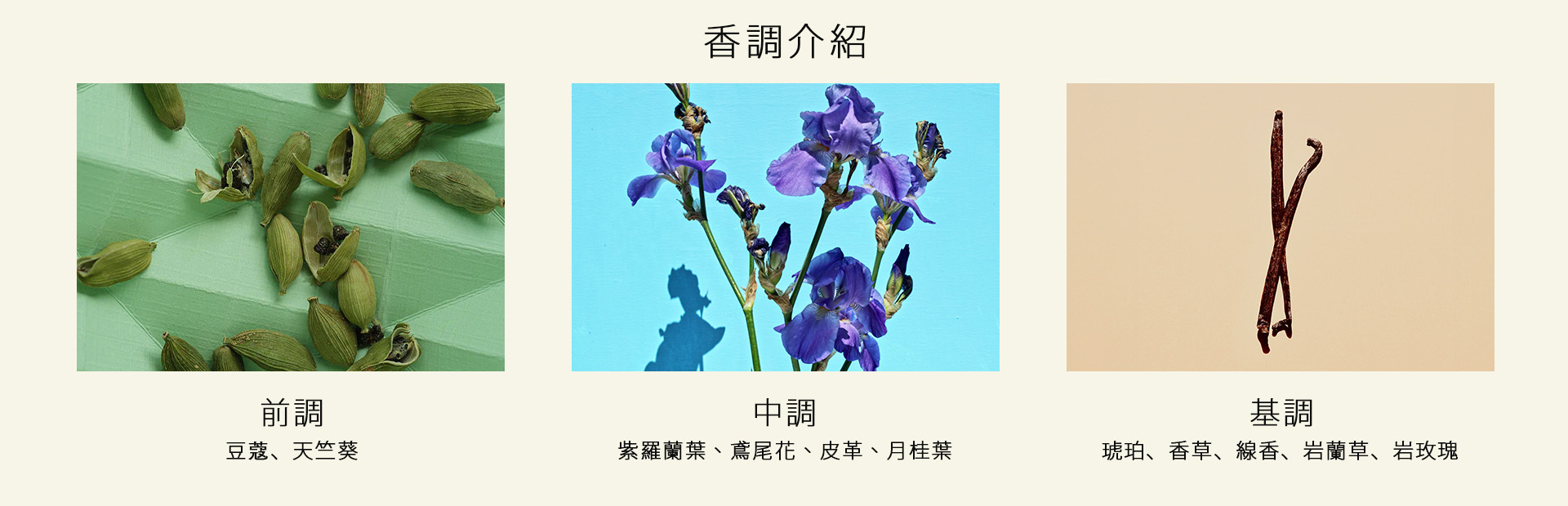 男性經典香水,巧妙融合了柔和的香草、皮革與小豆蔻,完美詮釋了文雅的紳士氣息。小豆蔻與天竺葵共同譜寫出清新明快的前調,紫羅蘭葉、鳶尾花、皮革與月桂葉在中調中綻放,營造出洗鍊而高雅的氛圍。最後,琥珀、香草、線香、岩蘭草與岩玫瑰為後調增添持久而迷人的芳香。