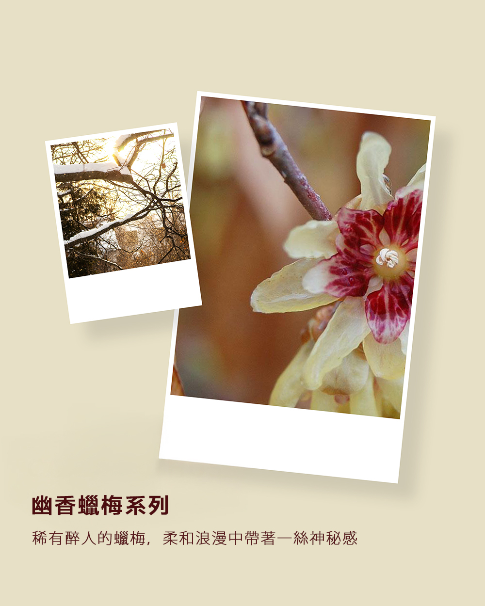 眾花沉睡時,蠟梅於深冬悄然綻放,散發出清新花香,氣息明亮而馥郁。佛手柑、植物荳苗和橙花營造出一場嗅覺交響樂的低語。中調是茉莉花和蠟梅,尾調則為桃子和橙花蜂蜜,體現出溫柔守護的氛圍,像是冬日無聲的保護者。