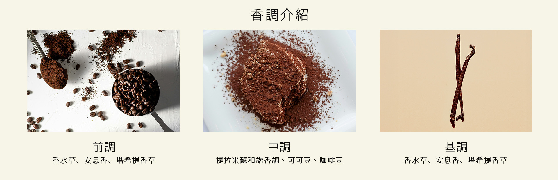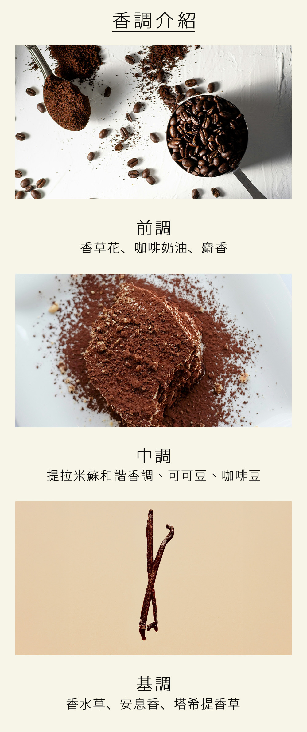 以提拉米蘇為靈感,引領您穿越特雷維索的味蕾街巷 — 甜點的發源地,也是ACCA KAPPA 歷史的起點。香氛具琥珀、甜美的香氣,以巧克力與咖啡譜寫序曲,吟唱香草輕柔的氣息,令人陶醉於美好時光,是一首獻給特雷維索、其獨特的美食文化,以及意大利風情的真摯頌歌。