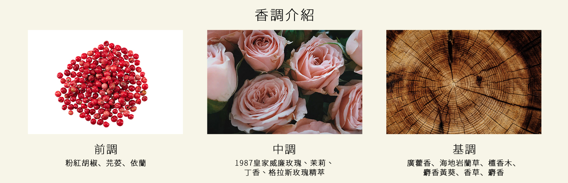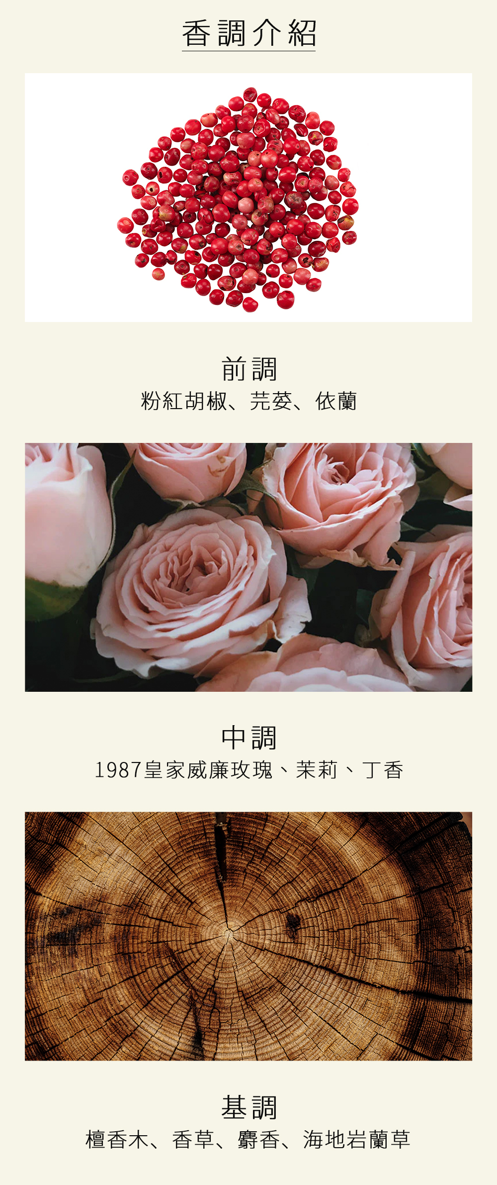 香氣以撩人的粉紅胡椒、芫荽和依蘭揭開序幕,漸次綻放出迷人的花香,令人心醉神迷。當香氣漸次綻放,丁香、廣藿香、岩蘭草及雪松的溫暖芬芳隨之而來,柔和交織著香草、檀香與一抹麝香,營造出層次豐富且難以忘懷的香氛體驗。