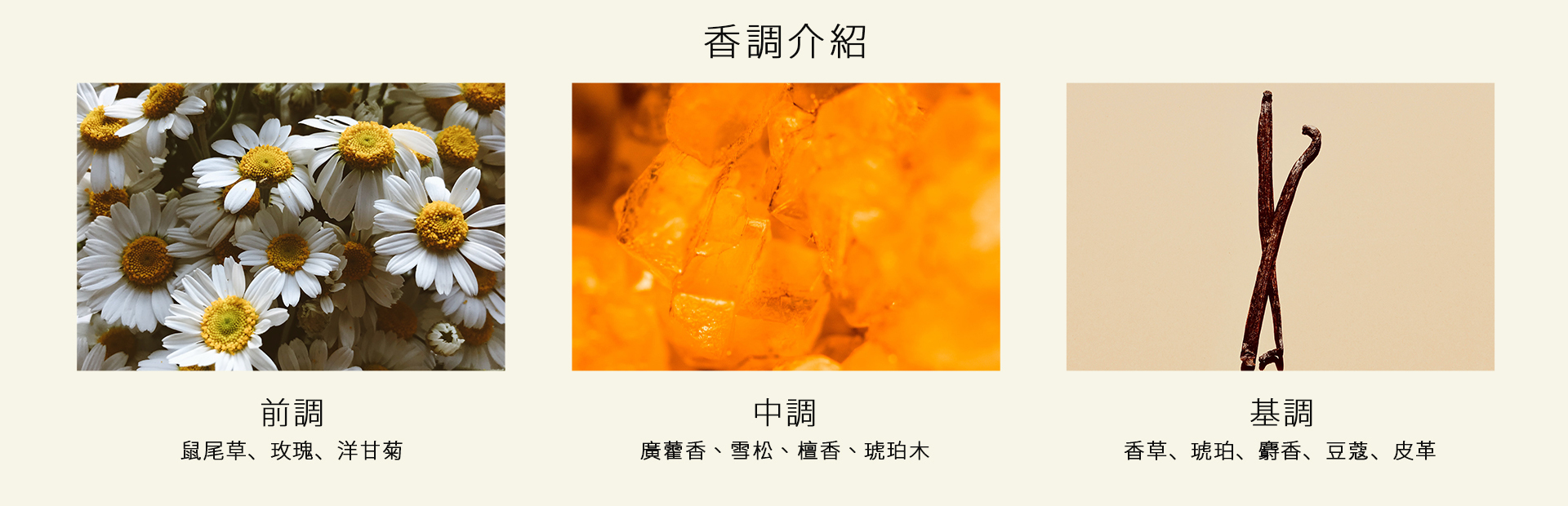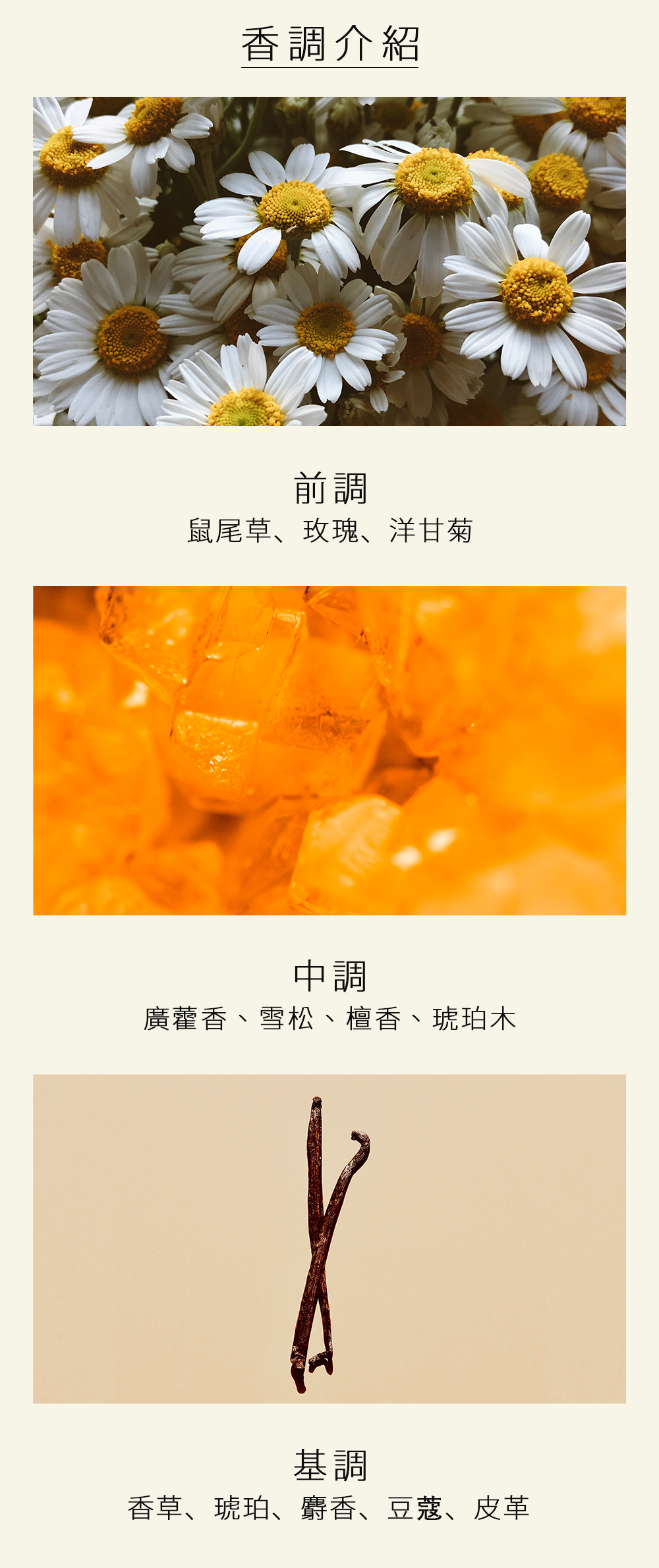 以玫瑰和鼠尾草的甜美溫暖草本香調開場,悠淡的花草氣息,如同田園廣大草原;隨後,雪松和檀香的木質香調緩緩展開,帶來遠方重山沉穩而寧靜的感受;最後以冬青豆和琥珀的醉人香氣,營造出神秘森林之深的香氣,小隱隱於山,生活應本於濃郁樸實,偶有淡淡的甜味點綴為最佳。