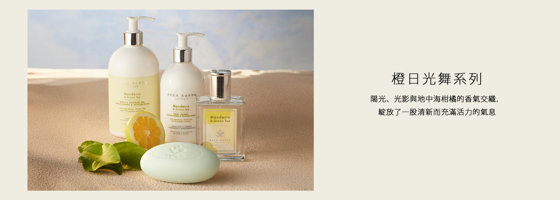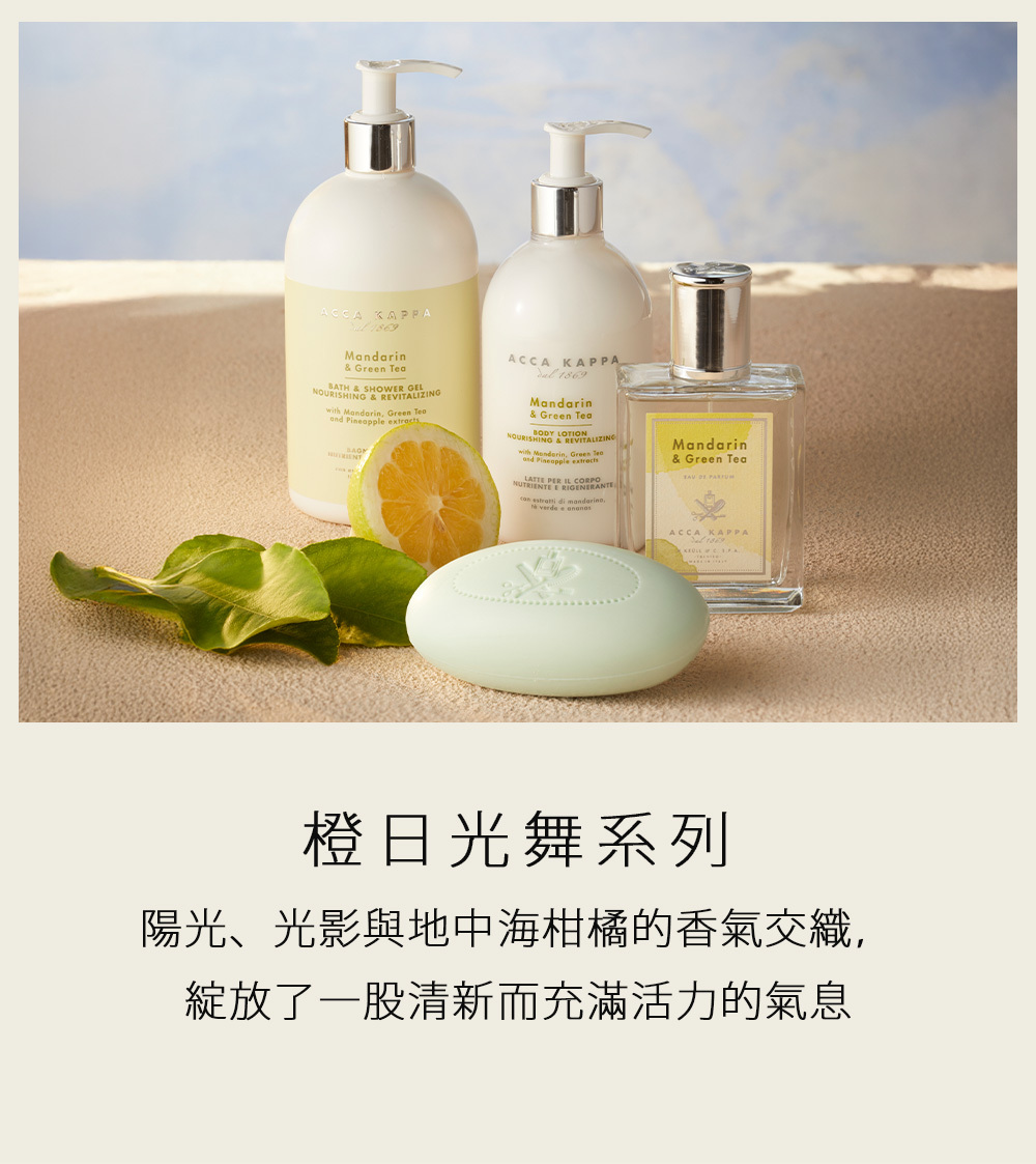 陽光、光影與地中海柑橘的香氣綻放了一股自然的生命力。以綠茶與橙、葡萄柚、橘子與佛手柑精油呈現了活力氣息。成分天然潔淨,維持肌膚平衡,菠蘿、人參與橘子萃取物,賦予肌膚焕發光采 ; 金盞花滋養舒緩。質地溫和,適用於各種膚質,為肌膚帶來清爽活力。