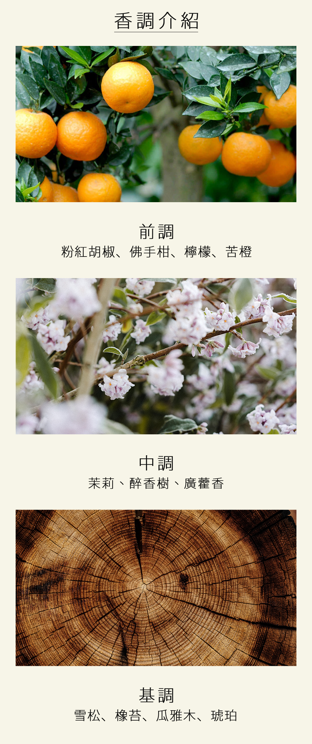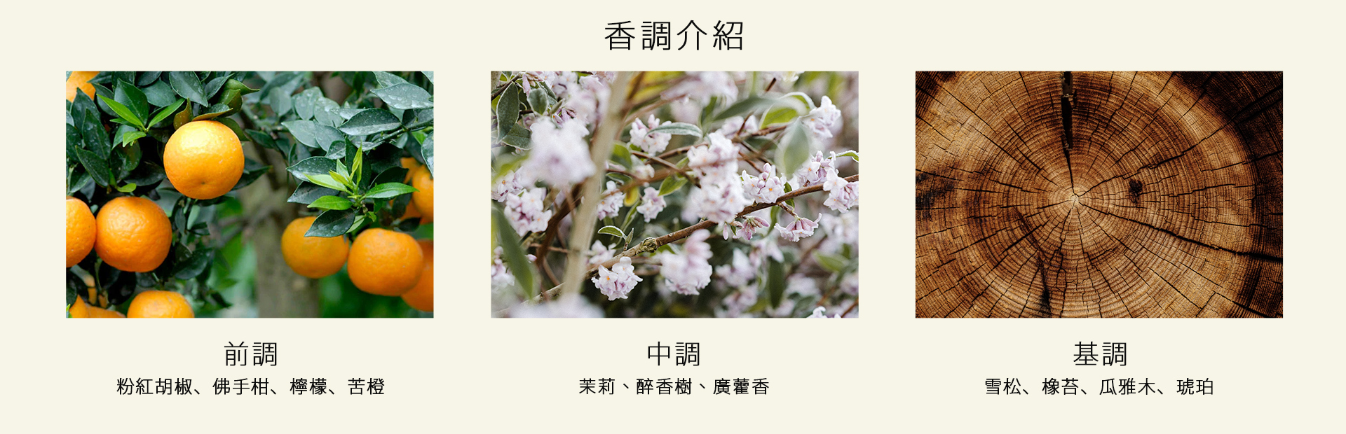 無數顆粉紅胡椒帶來既甜美又辛辣的氣息,點燃心中的熱情。檸檬和苦橙的柑橘香調率先奏響,如同初啼後的首發禮讚在空氣中迴盪;而廣藿香的濃郁則如夜空般,愈發無限的遐想;木質雪松的香氣則像一座連接過去與未來的橋樑,將所有香氣巧妙地連接起來。