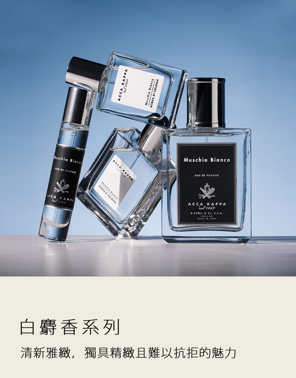 ACCA KAPPA 經典的⽩麝香,引領您⾄義⼤利春⽇的清新氣息。初調以⼀抹檸檬、佛⼿柑和杜松果,開啟柑橘芬芳之⾨。薰⾐草與甜⽊⾹為核⼼調⾹,喚醒了⼀座感官馥郁的花園。餘韻間,⽩麝⾹與琥珀交織,別俱精緻且難以抗拒的魅⼒:清新、雅緻,堪稱現代經典之作。